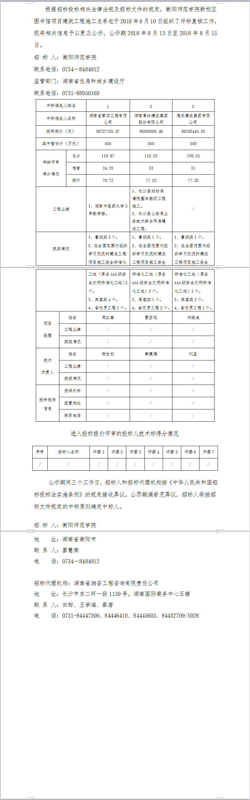 衡阳师范学院新校区图书馆项目建筑工程施工总承包招标投标信息公示表更正公示