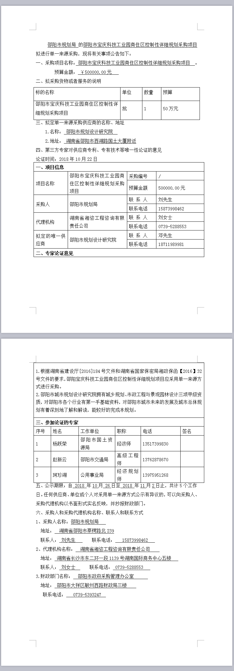 邵阳市宝庆科技工业园商住区控制性详细规划采购项目 单一来源论证公示