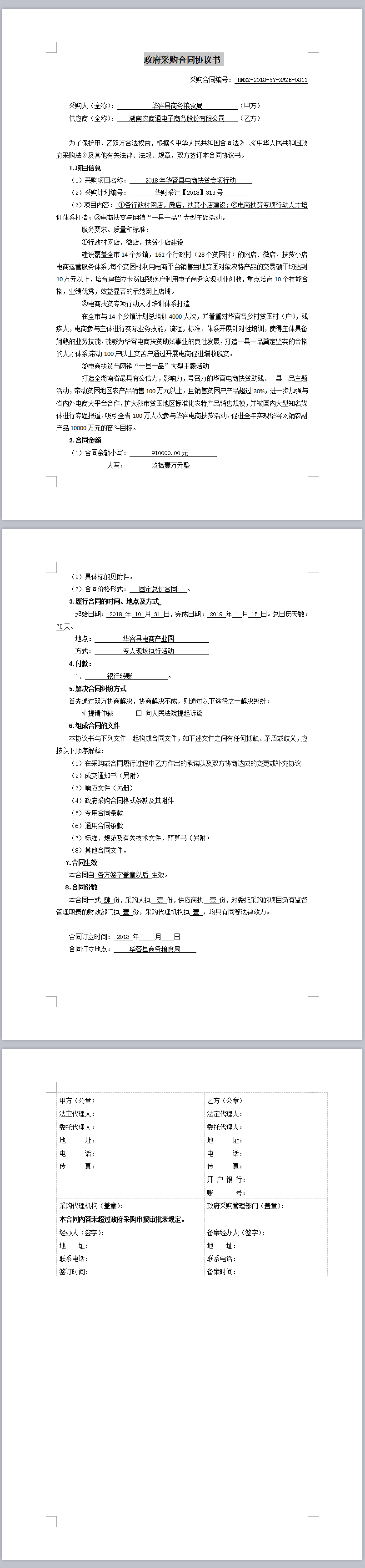 2018年华容县电商扶贫专项行动政府采购合同协议书