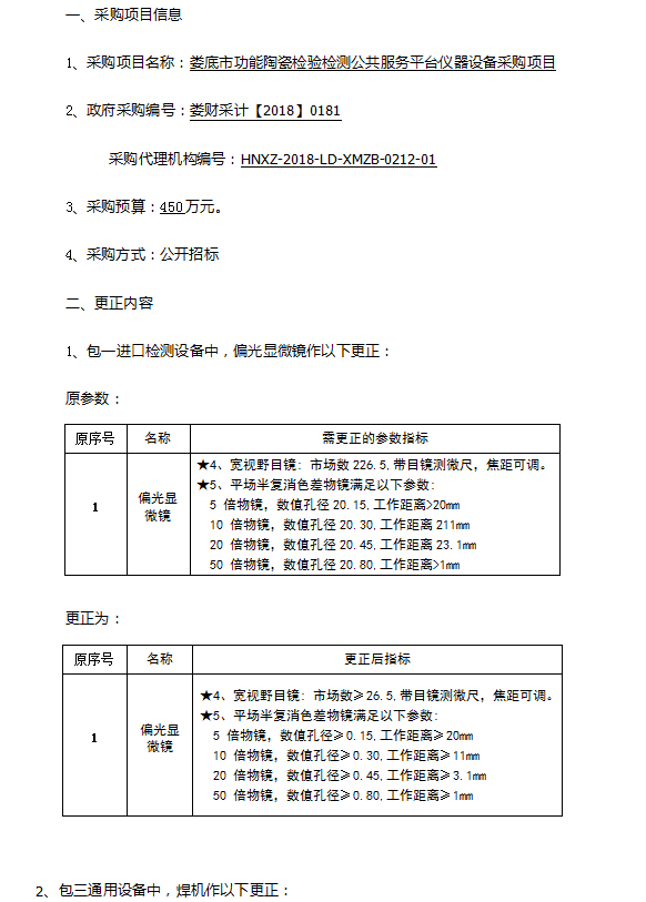 娄底市功能陶瓷检验检测公共服务平台仪器设备采购更正公告